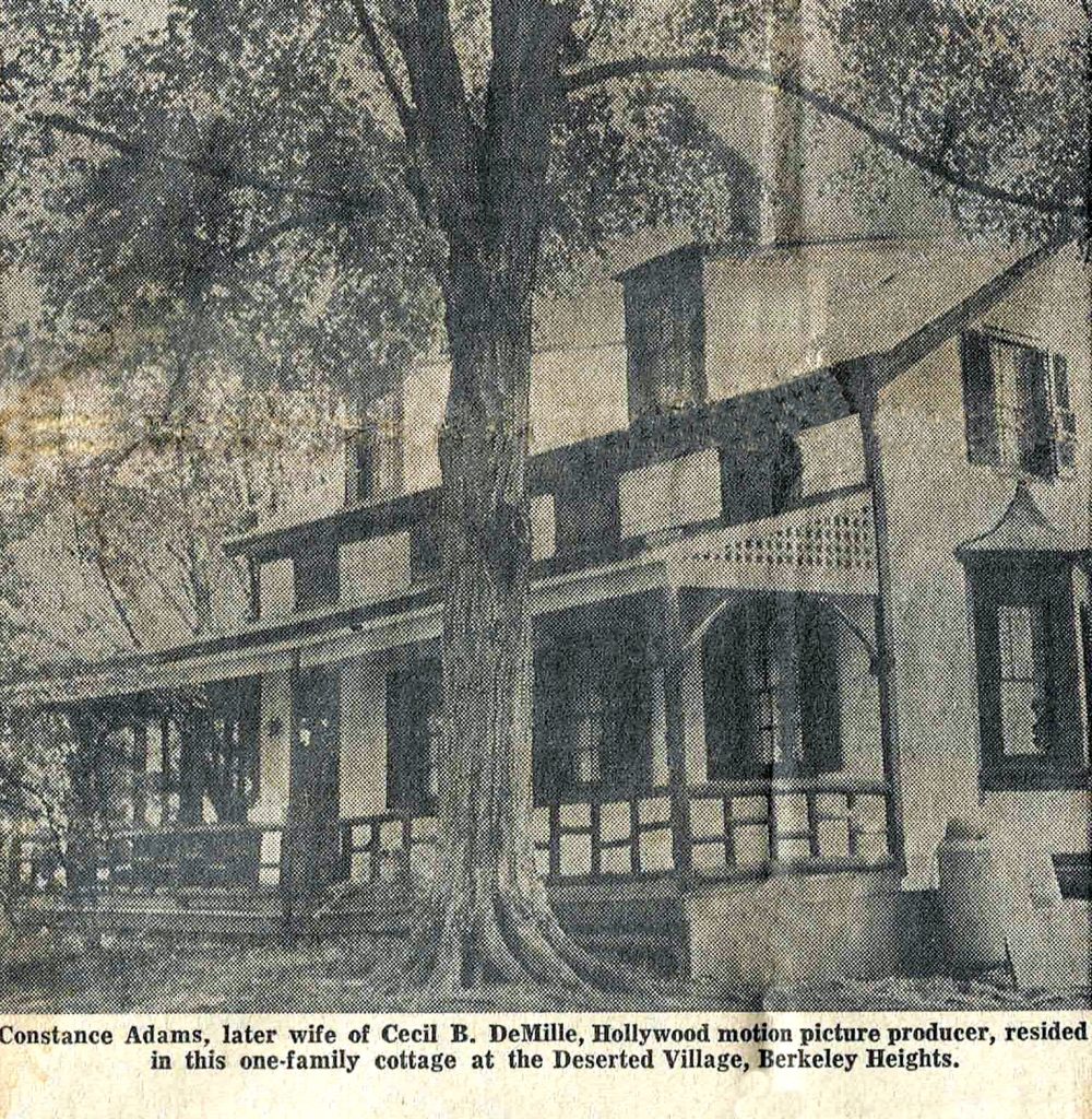 That rediscovered evidence is in a 1965 article on the village by Jean Rae Turner, a local historian and staff writer for The Daily Journal, a newspaper out of Elizabeth, New Jersey. In that article, Turner relied on my grandfather as her history source for a full-page article entitled “History, Hidden Charm in Deserted Village.” The article featured pictures of my grandfather, and all of my siblings (except one not yet born) and I in various village locations. The only picture not of one of us is of one of the village’s cottages, with the caption “Constance Adams, later wife of Cecil B. DeMille, Hollywood motion picture producer, resided in this one-family cottage at the Deserted Village, Berkeley Heights.” Proof positive that Grandpa knew!